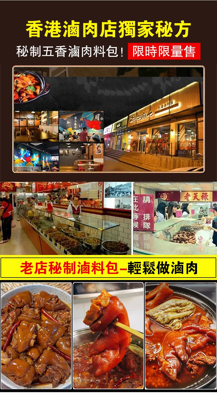 5分鐘前【限時搶購】秘製鹵料包 有了這個秘製滷料包,想吃什麼就滷什麼!百年老店獨家秘製配方,自己在家做,乾淨又衛生,味道比外面賣的還好吃~十八味秘制鹵肉料包 - 3包(30袋)NT$998